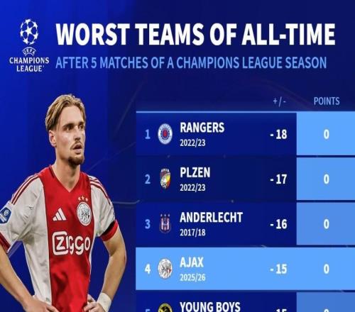 欧冠单赛季前5轮最差成绩TOP10:本赛季的贾府0分净负15球第4 -